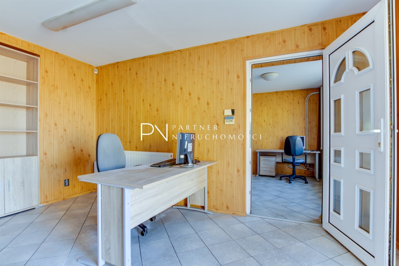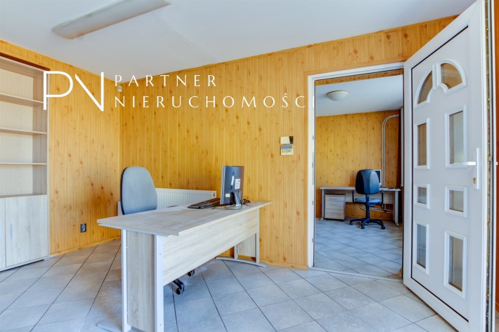 - Budynek administracyjny użytkowany jest na parterze na cele handlowo-usługowe a na piętrze na cele mieszkalne. Obiekt murowany z dachem dwuspadowym krytym papą o powierzchni zabudowy 130m2. Budynek z lat 60-tych. Okna PCV, posadzki płytki ceramiczne/ panele. Łazianki w płytkach, Instalacja elektryczna, wodno-kanalizacyjna częściowo wymieniona. Instalacja centralnego ogrzewania, pompa ciepła, klimatyzacja. Budynek ocieplony.