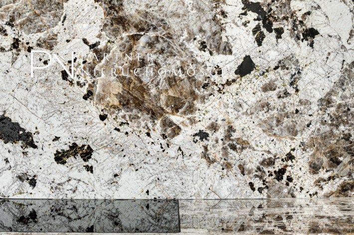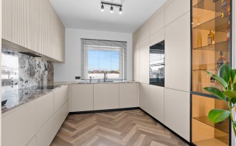 Naturalny kwarcyt marki Choder, zastosowany na blacie oraz ścianie roboczej nadaje wnętrzu szlachetności i trwałości.