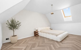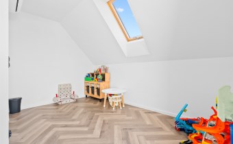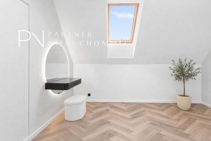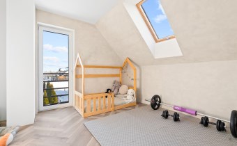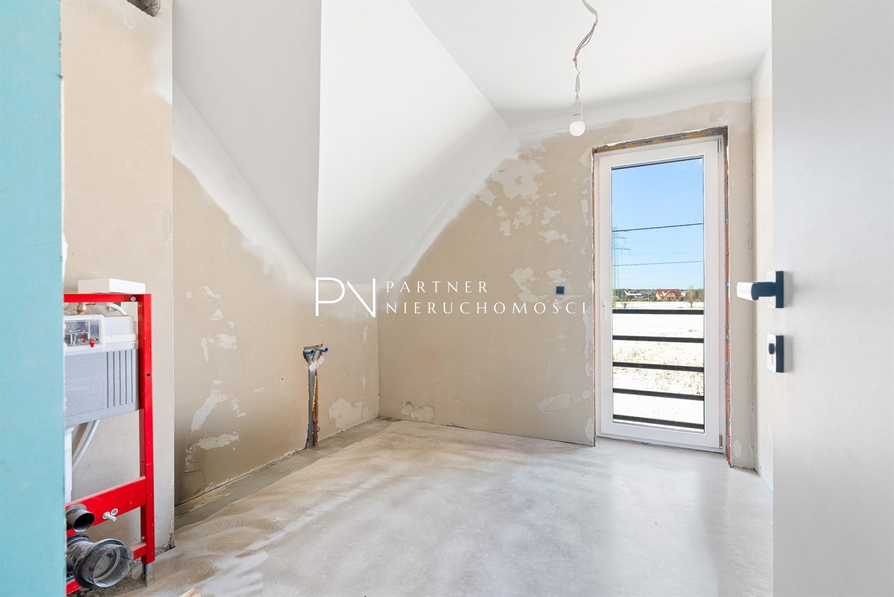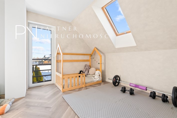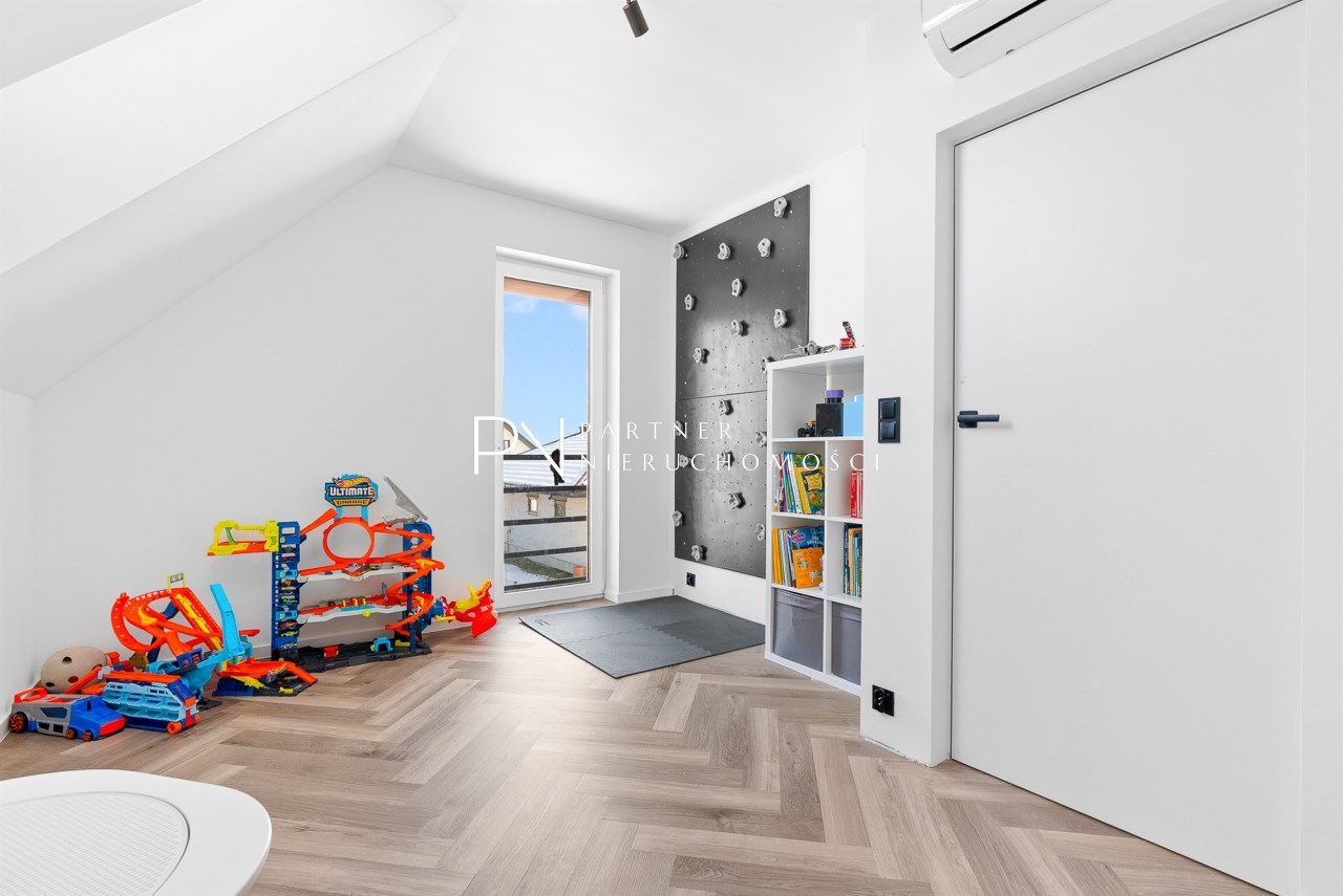 Piętro to przestrzeń zaprojektowana z myślą o wyciszeniu i prywatności. Znajduje się tu duża sypialnia główna, trzy dodatkowe pokoje (obecnie dwa dziecięce, oraz garderoba), przestronna łazienka w stanie deweloperskim — przygotowana pod indywidualny projekt przyszłego właściciela, który może stworzyć tu swoją prywatną strefę relaksu.