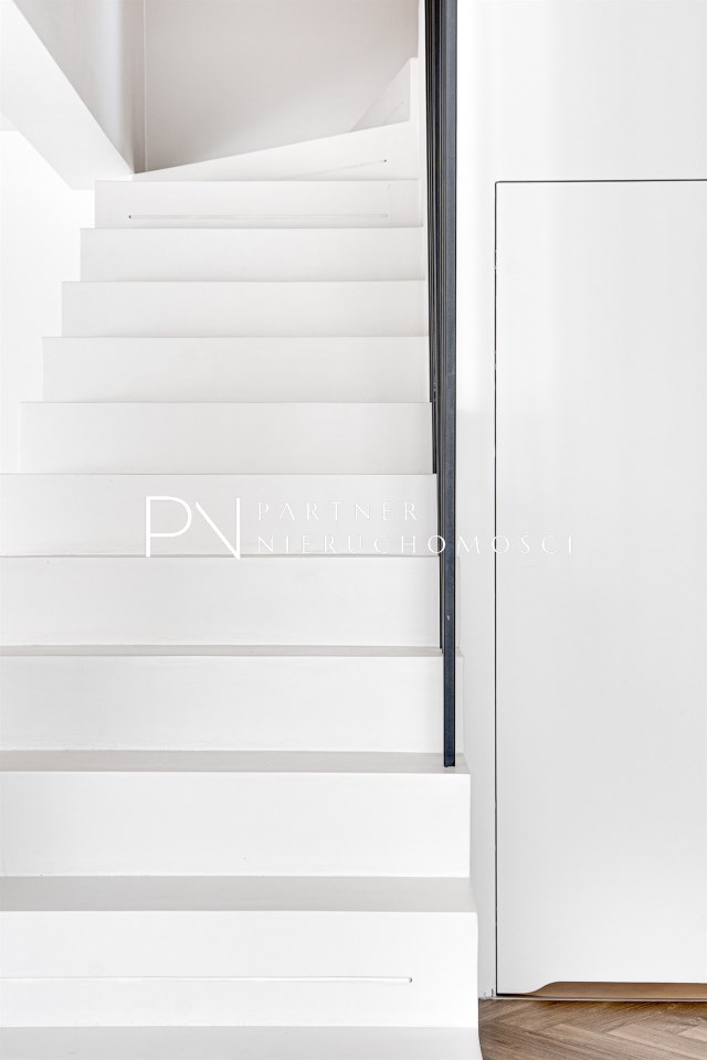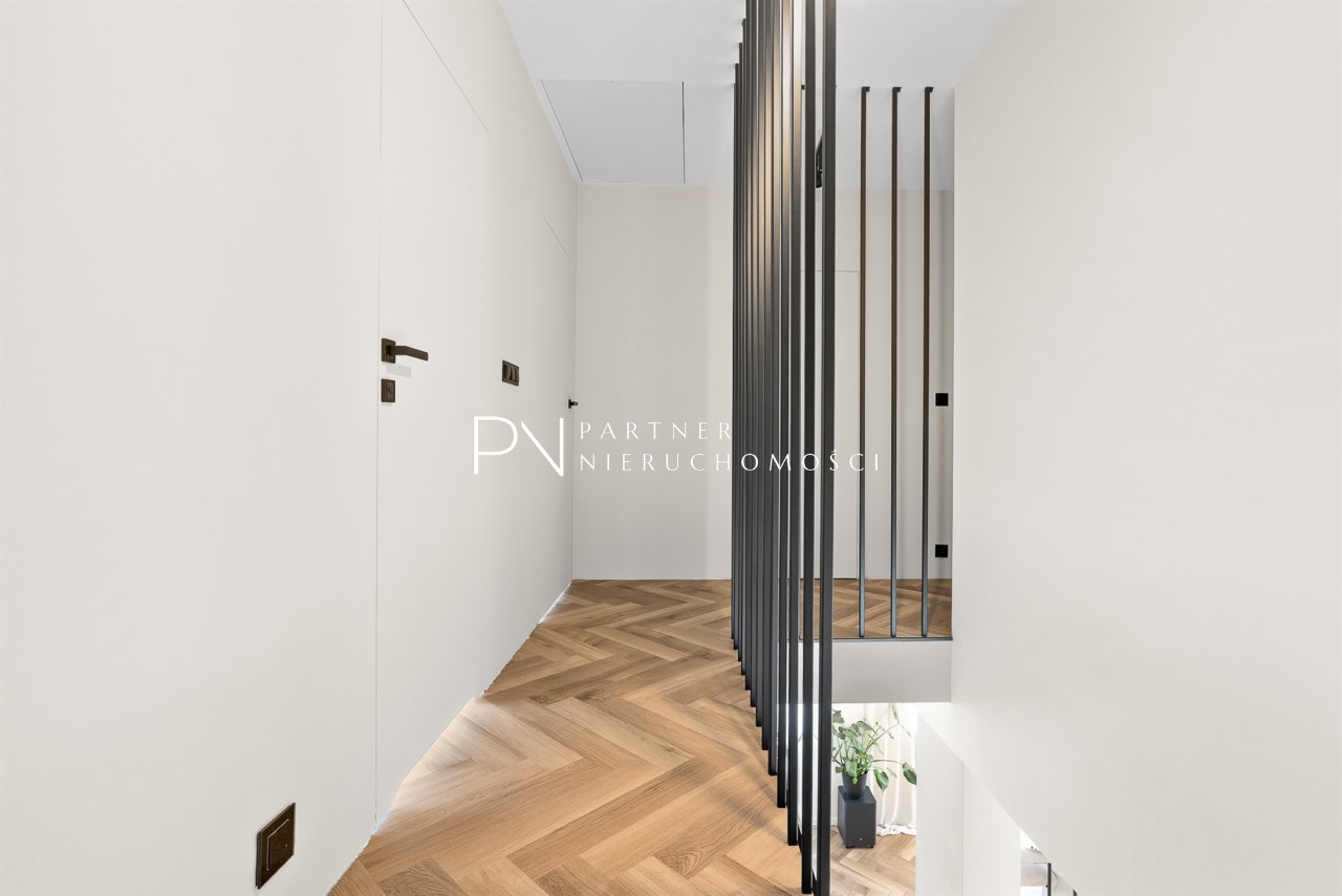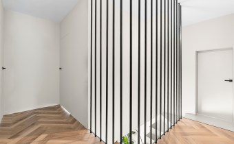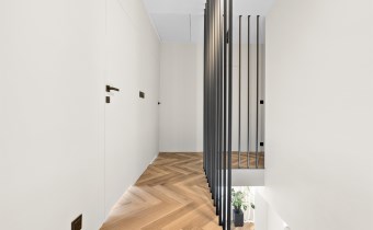 Podłoga ułożona w elegancką jodełkę podkreśla ponadczasowy charakter wnętrza. Nowoczesne schody wykończone mikrocementem w połączeniu z czarną, minimalistyczną balustradą stanowią mocny, architektoniczny akcent tej przestrzeni.