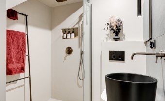 Na parterze znajduje się również łazienka wykończona w mikrocemencie, hol, kotłownia z miejscem na pralkę oraz garaż w bryle budynku.
