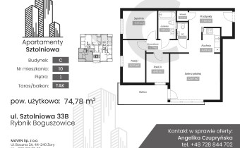 Prezentowane mieszkanie o powierzchni 74,78 m² składa się z czterech pokoi, kuchni częściowo otwartej na salon, łazienki, wc, schowka/garderoby, oraz przedpokoju (podglądowy rzut mieszkania znajduje się w galerii zdjęć). Nieruchomość usytuowana jest na 1 piętrze i posiada balkon stanowiący dodatkową przestrzeń do wypoczynku.